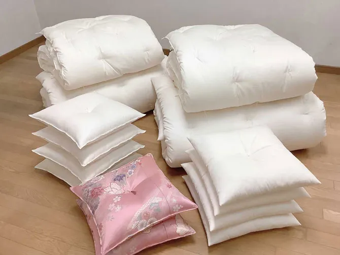 広島県のお客様から、婚礼布団や押し入れに眠っている布団をリメイクしたいとご連絡いただきました。 お客様用の布団に使いたいけど重くて使えないので、どうしたらいいか、何にリメイクできるかご相談いただきました。 綿の打ち直しが…