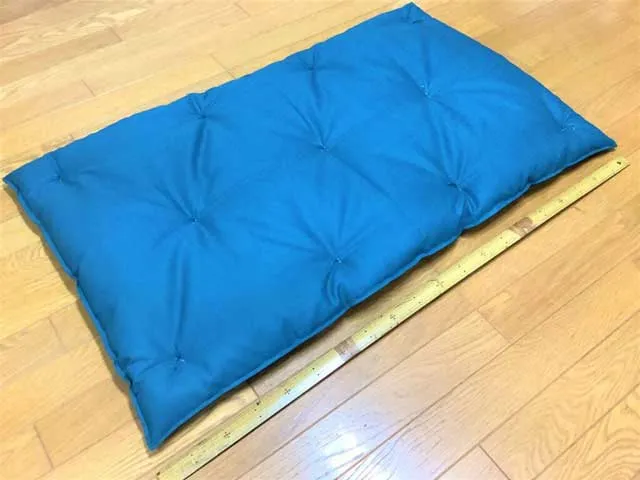 前回の「婚礼座布団をごろ寝用敷布団とソファー用長座布団にリメイク」で残った打ち直しの綿と生地で、座卓の脚用座布団をお仕立てしました。 サイズは13×13cmをご指定いただきました。 小さな物も手作業で仕立て 生地を13×…