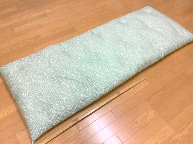 兵庫県のお客様から、使わない敷布団のリメイクをご依頼いただきました。 ご注文内容は、シングル敷布団を70×180cmのごろ寝用敷布団にリメイクです。 多くの生地の中から、ミントグリーン色の白い点の波模様のある、洋風の部屋…