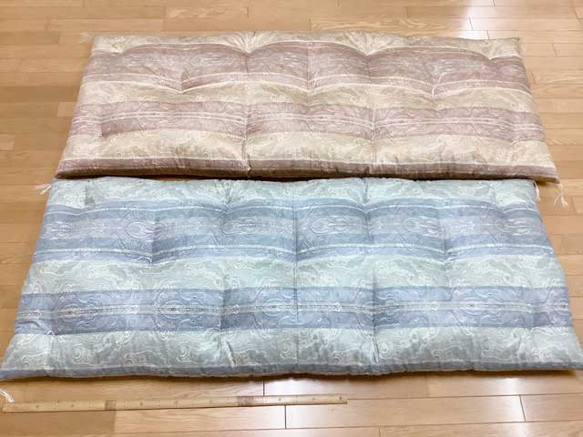 兵庫県のお客様から、「以前に仕立てた綿の敷布団の寝心地が良かったので、使わず押し入れに眠っている40年前の婚礼座布団を、敷布団に仕立て直しできませんか?」と、お問い合わせいただきました。 八端判座布団(59×63cm)1…