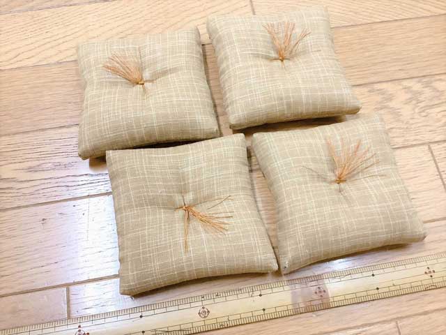 前回の「婚礼座布団をごろ寝用敷布団とソファー用長座布団にリメイク」で残った打ち直しの綿と生地で、座卓の脚用座布団をお仕立てしました。 サイズは13×13cmをご指定いただきました。 小さな物も手作業で仕立て 生地を13×…