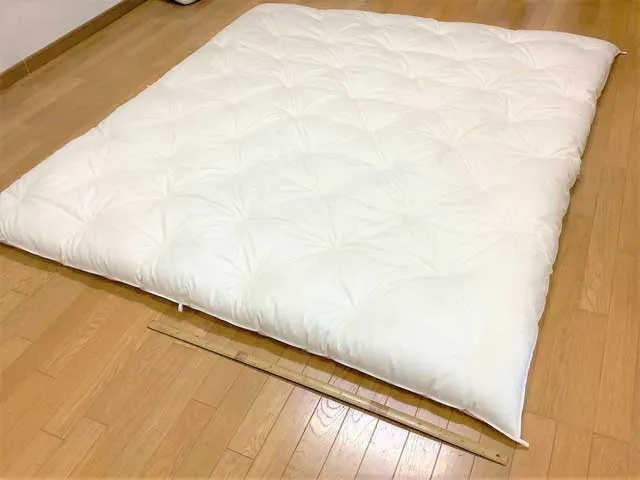 兵庫県のお客様から、以前当店でお仕立てしたシングルサイズの冬掛け布団と合掛け布団を打ち直し、ベッド用の薄くて軽いシングル敷布団2枚の仕立て直しをご依頼をいただきました。 「テレビの特集番組で、綿の布団がとても寝心地が良い…