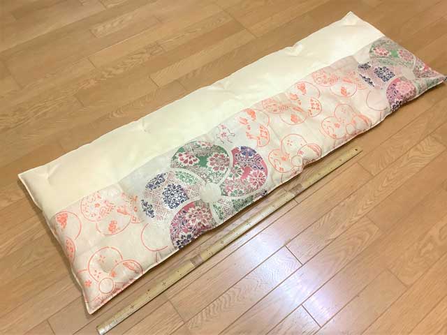 兵庫県のお客様から、着物の帯で50×150cmのソファーで使う長座布団のご注文をいただきました。 以前、お客様が来店された際、他のお客様から注文いただいた着物で仕立てた座布団を見て、興味を持ったそうです。 着物の帯を縫い…