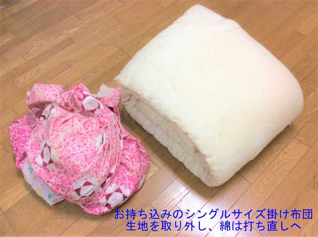 お持ち込みの掛け布団は、綿100%わた3.2キロ入りのシングルサイズです。