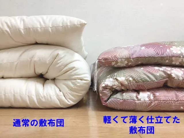 この度のお客様は、マットの付いたベッドの上に敷いてお使いになられているとの事で、軽い敷布団にしても問題なくお使いいただけます。