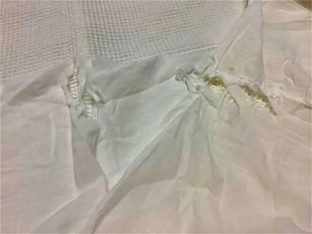表のワッフル生地を傷めないように、丁寧に糸を切り、破れた裏生地を取り外します。