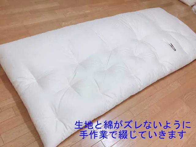 手作りと言っても色々な業者があり、敷布団のサイズにカットされた綿をただ重ねるだけの仕立てや機械綴じとは違います。