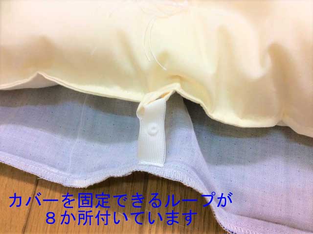 布団の生地には、カバーの留めひもを固定できるように、ループが8か所付けています。