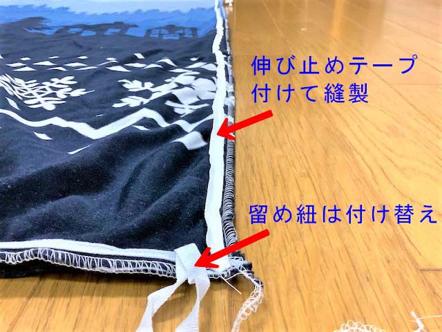 元の毛布カバーの縫製にも伸び止めテープが使われているのを確認できると思います。