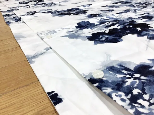 購入された海外製の掛けカバーは綿100%サテン生地、サイズは234×244cm、足元にボタンで閉じる布団の入れ口があり、3辺には額縁がある掛カバーでした。