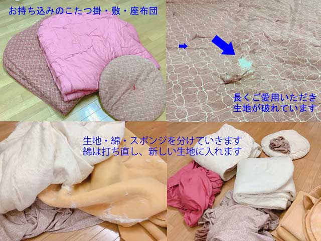 お持ち込みのこたつ布団は、生地が破れるまで長らくご愛用いただきました。