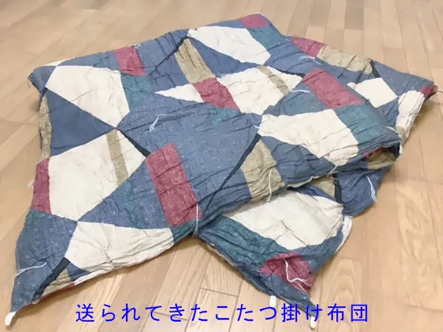 さっそく静岡からこたつ掛け布団をお送りいただき、中綿を確認しました。