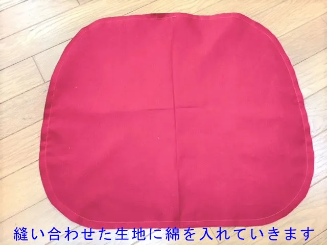 背もたれクッションも馬蹄型座布団と同じく、サイズに合わせて生地をカットし、ミシンで縫い合わせ、綿を入れていきます。