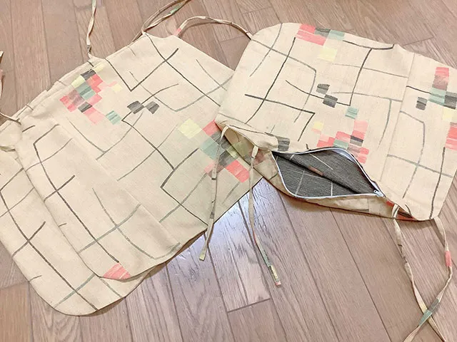 カバーも座布団と同じように型紙に合わせて反物を裁断し、ファスナーを取り付け縫製します。