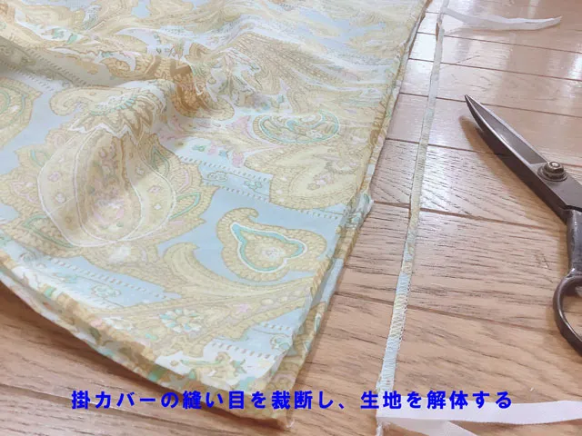 ベッドカバー(マルチカバー)をできる限り大きくお仕立てできるように、縫い目ギリギリを切り落とし、生地2枚にします。