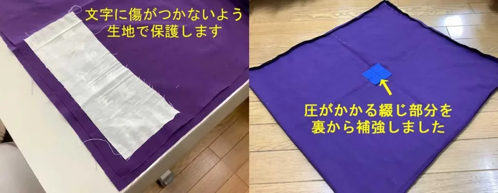 少し薄い生地でしたので、一番圧がかかり破れやすい中央部分に生地の裏から布をあて、補強しました。