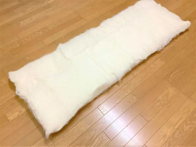 前回、通常の敷布団(シングルサイズ)約6キロから、ベッド用の薄い敷布団(シングルサイズ)約4キロを仕立て直しの際に余った、綿100%ワタを使用し、ソファー用の50×150cmの長座布団を仕立てました。