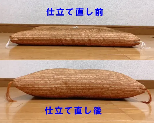 仕立て直し前の座布団と仕立て直し後の座布団を比較すると、ふっくらとし新品同様に生まれ変わったのが分かります。