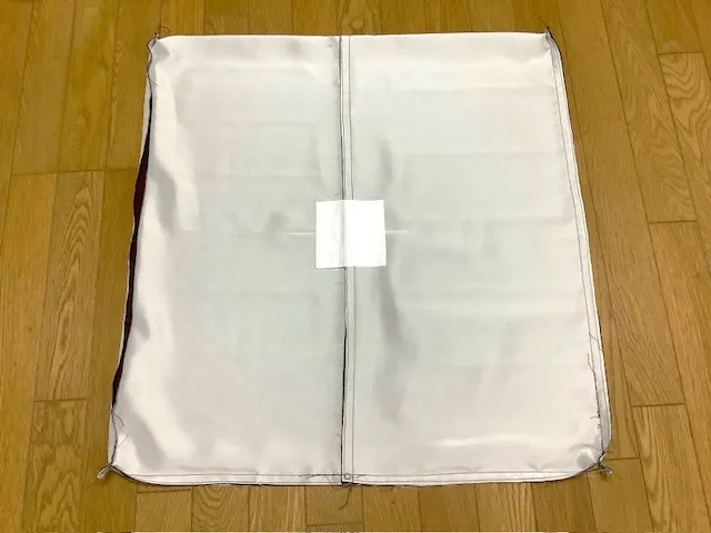 座布団の中央と四隅には生地と綿がズレないように綴じを施しますが、中央部分は圧が強く、生地が弱い正絹では2枚合わせでも不安が残るため、綿のブロード生地を中央の綴じ部分(両面)に付けました。